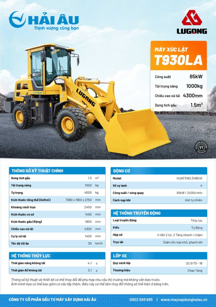 Máy xúc lật Lugong T930LA, do Công ty Cổ phần Đầu tư Máy xây dựng Hải Âu phân phối, là một sản phẩm chất lượng cao của thương hiệu Lugong. Với động cơ Huafeng hiệu suất cao, dung tích gầu lớn và khả năng nâng hạ vượt trội, T930LA là sự lựa chọn đáng tin cậy cho nhiều công việc khác nhau.